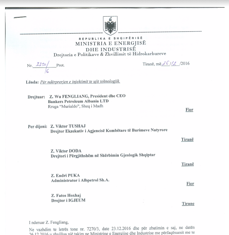Më 26 dhjetor 2016, Presidenti dhe Drejtori i Përgjithshëm i “Bankers Petrolium”, z. Wu Fengliang, mori një shkresë, me numër protokolli 7270/6 nga Ministria e Energjisë, të nënshkruar nga zv/ministri i Energjisë, Ilir Bejtja. Në këtë shkresë i kërkohej “Banker Petroleum” që:
