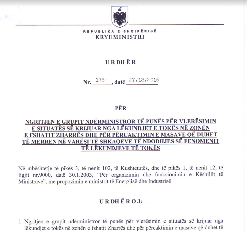 Nën presion nga grevistët e Zharrëzës (dhjetor 2016), si edhe nga fakti se deputiti i LIBRA-s, Ben Blushi, i dha jehonë në opinionin publik, kryeministri Edi Rama nxori me shpejtësi Urdhrin nr. 178, datë 27.12.2016 për të ngritur një grup ndërministror për vlerësimin e gjendjes në Zharrëz, pas lëkundjeve të tokës. (Çuditërisht Urdhri i Kryeministrit Rama del në të njëjtën ditë, pasi deputeti Blushi u prit masivisht nga banorët e Zharrëzës).