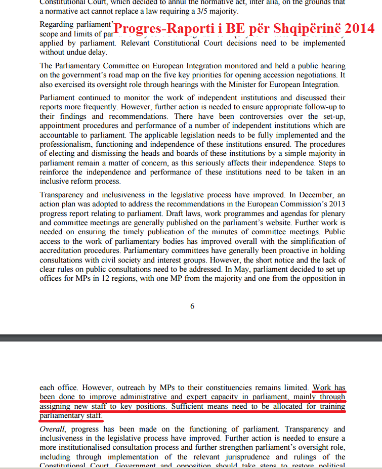 “Është punuar për të përmirësuar kapacitetet administrative dhe të ekspertizës në parlament, kryesisht duke vendosur personel të ri në poste kyçe. Mjete të mjaftueshme duhet të vihen në dispozicion për të trajnuar personelin”, thuhet në fq. 7 të Progres-Raportit të BE-së për Shqipërinë i vitit 2014, për Parlamentin.