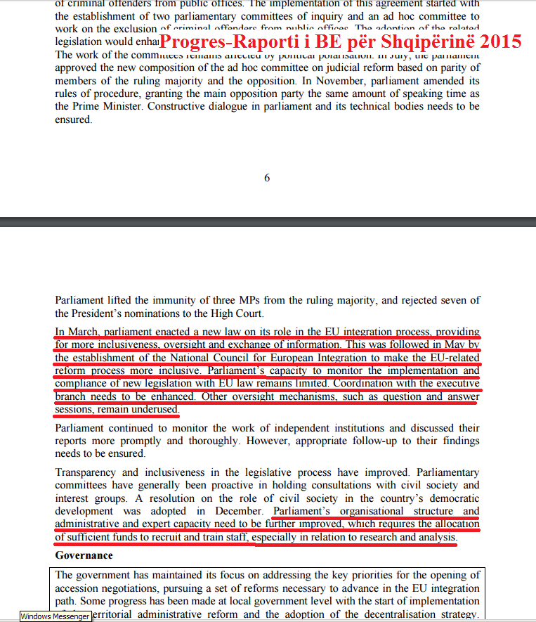 “Në mars, Parlamenti miratoi një ligj të ri për rolin e vet në procesin e integrimit në Bashkimin e Evropian, për të mundësuar më shumë përfshirje, mbikëqyrje dhe shkëmbim informacioni. Kjo u pasua në maj me themelimin e Këshillit Kombëtar të Integrimit Evropian për ta bërë procesin e reformave të lidhura me Bashkimin Evropian më përfshirës. Kapaciteti i Parlamentit për të monitoruar zbatimin dhe përputhshmërinë e legjislacionit me ligjet e Bashkimit Evropian vazhdoi të ishte i kufizuar. Koordinimi me degën ekzekutive duhet të rritet. Mekanizma te tjera mbikëqyrjeje, si seanca pyetje dhe përgjigjesh, vazhduan të ishin të papërdorura”, thuhet në fq. 7 të Progres-Raportit të BE-së për Shqipërinë i vitit 2015, për Parlamentin.