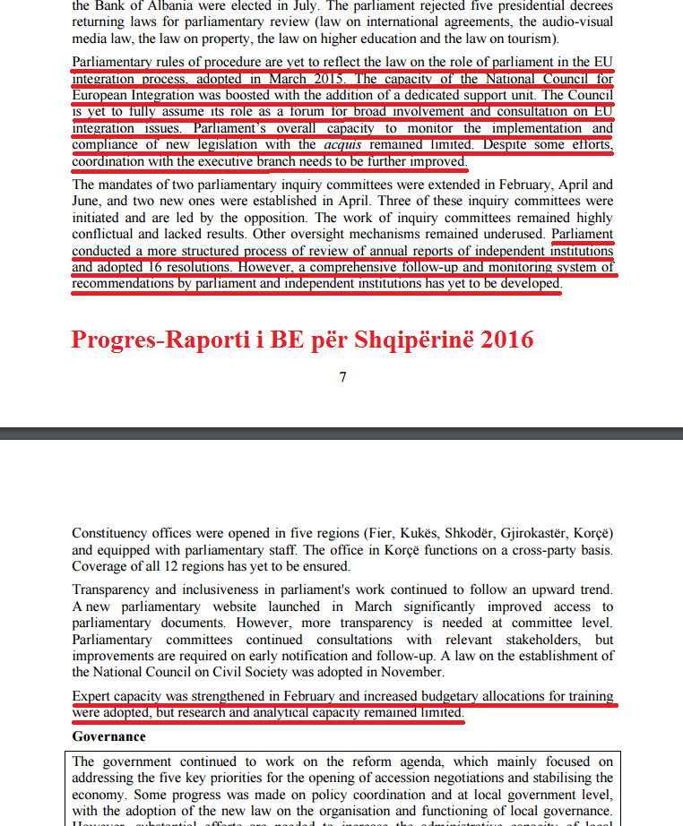 “Rregullorja e Parlamentit ende nuk pasqyron ligjin e rolit të Parlamentit ne procesin e integrimit në Bashkimin Evropian, të miratuar në mars 2015. Kapaciteti i Këshillit Kombëtar të Integrimit Evropian u rrit me shtimin e një njësie mbështetëse. Këshilli Kombëtar i Integrimit Evropian akoma nuk e ka marrë rolin e plotë të një forumi për përfshirje dhe konsultim të gjerë mbi çështje të Bashkimit Evropian. Kapaciteti i përgjithshëm i Parlamentit për të monitoruar zbatimin dhe përputhshmërinë e legjislacionit të ri me “acquis communautaire” (baza ligjore e Bashkimit Evropian) vazhdoi të ishte e kufizuar. Pavarësisht disa përpjekjeve, koordinimi me pjesën ekzekutive duhet që të përmirësohet më tej”, thuhet në fq. 7 të Progres-Raportit të BE-së për Shqipërinë i vitit 2016, për Parlamentin.